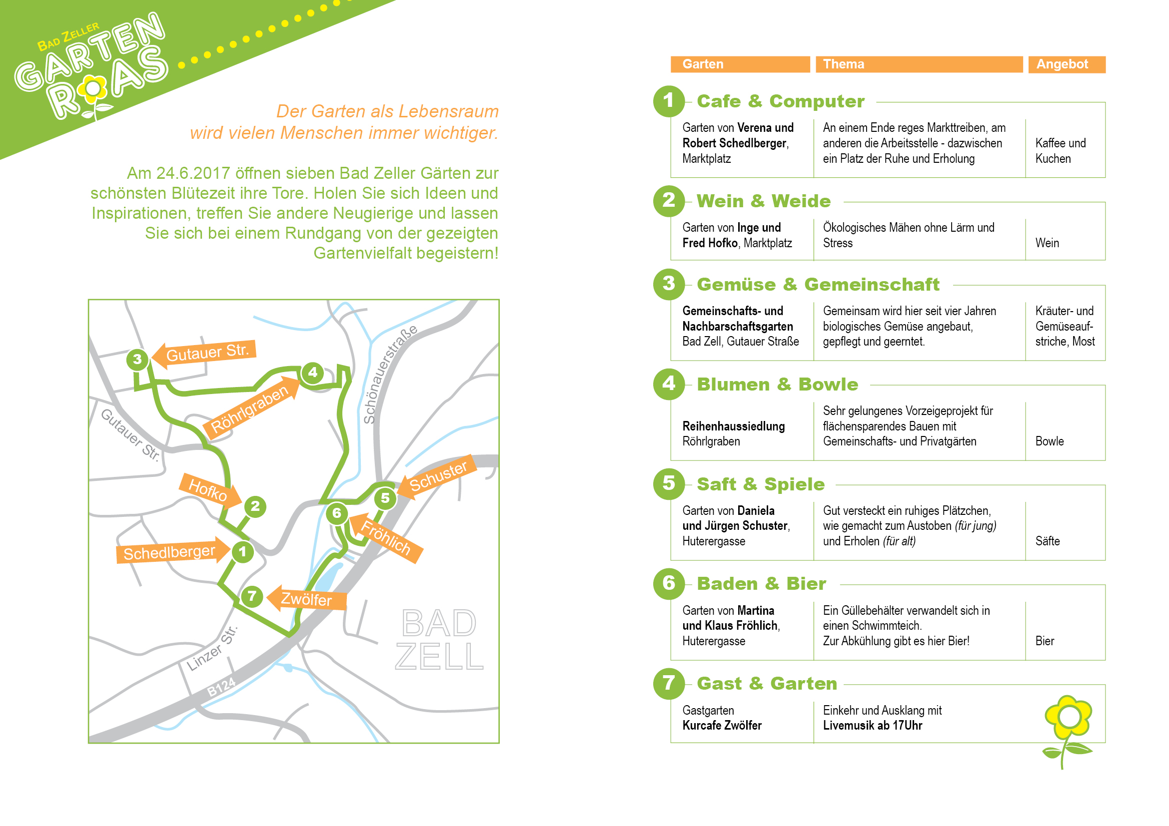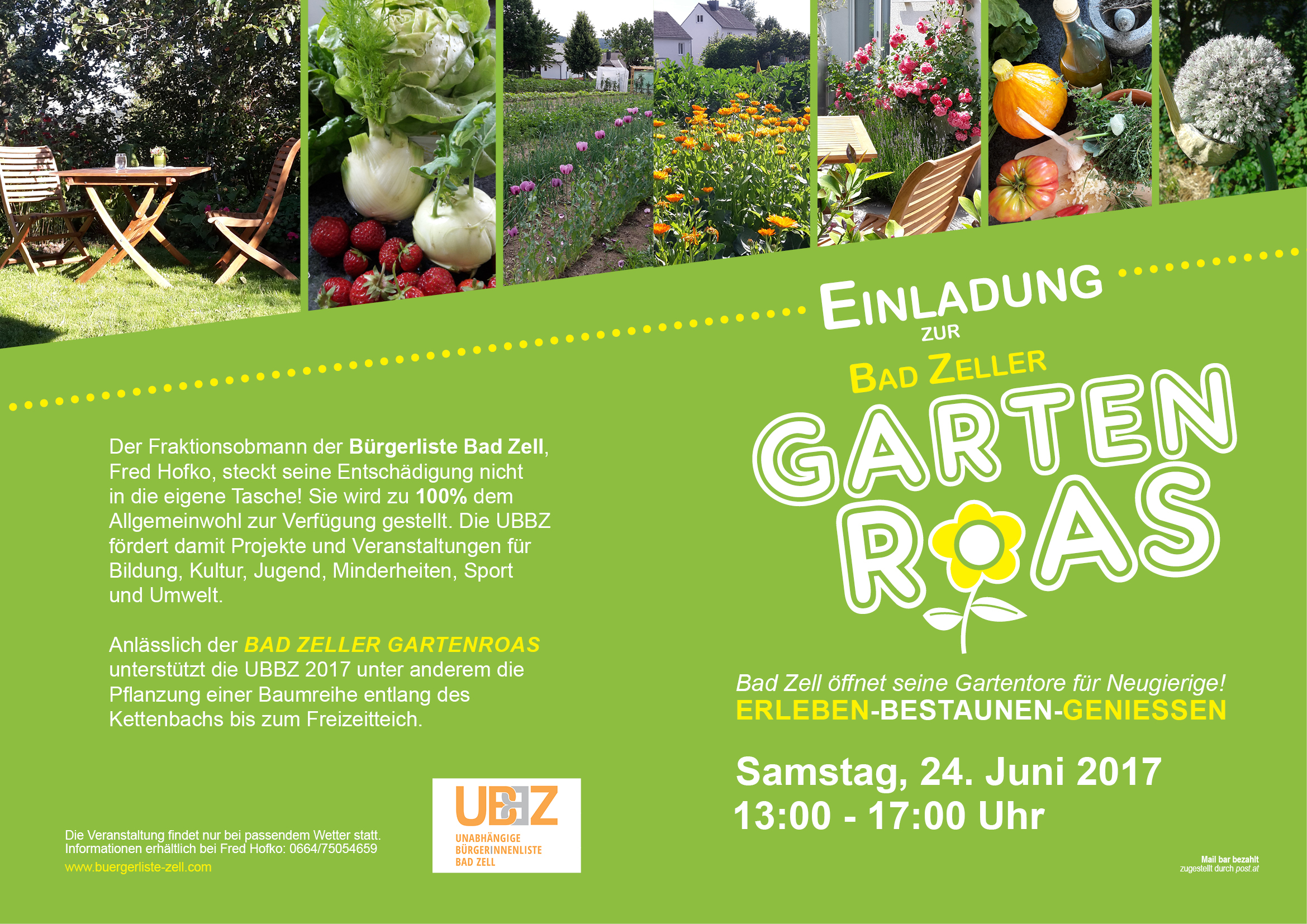 Wir konnten für die Gartenroas am 24.6.2017 mehrere Bad ZellerInnen gewinnen uns ihre Gartentore aufzumachen. Wir bedanken uns für die Offenheit und freuen uns, dass wir so den BesucherInnen eine große Gartenvielfalt zeigen können. Ein sehr sehenswertes und interessantes Programm erwartet die „Gartenreisenden“ .Bearbeiten