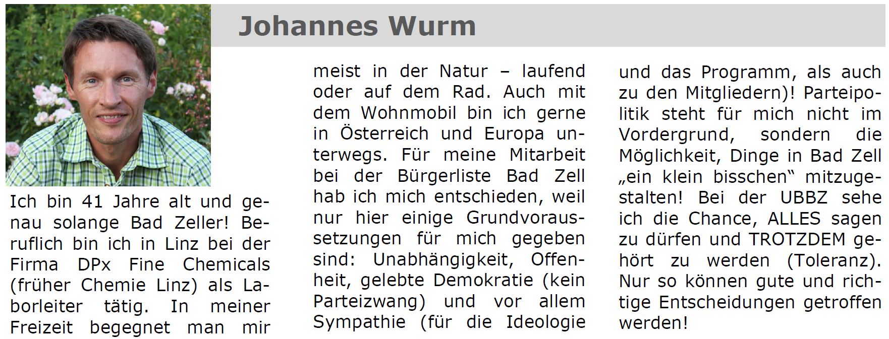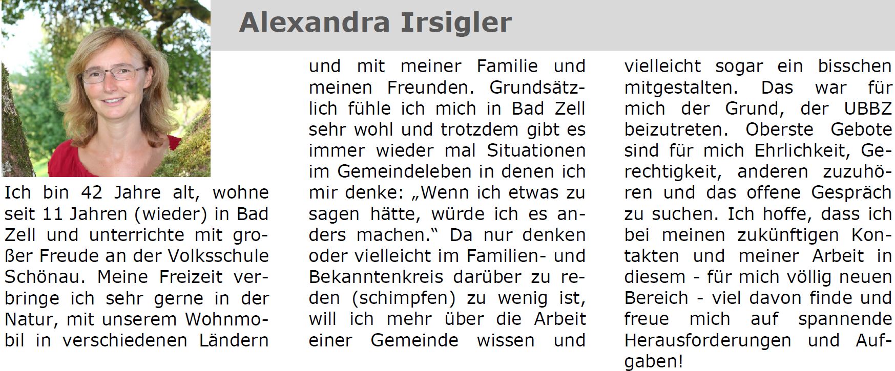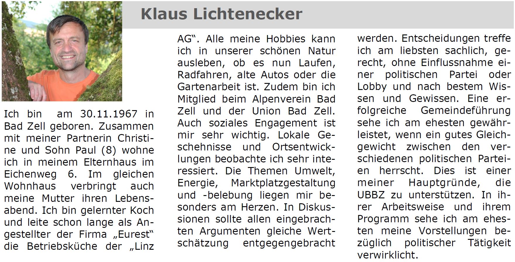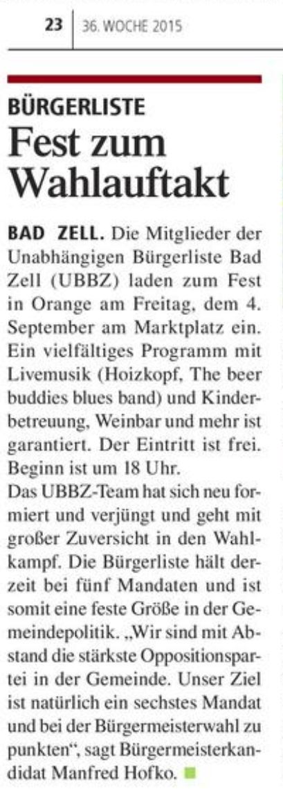 Wir, von der Unabhängigen Bürgerliste Bad Zell sind Menschen, denen das Wohl der Marktgemeinde am Herzen liegt, und die das Beste für das Zusammenleben aller erreichen wollen. Wir sind Persönlichkeiten, die zu ihren Entscheidungen stehen, die bereit sind, sich mit unterschiedlichsten Themenbereiche auseinander zu setzen und dafür auch Zeit investieren. Wir sind an keine Parteivorgaben von oben gebunden und fallen auch nicht um, wenn es kompliziert wird. Um mehr Einfluss in der Gemeindepolitik zu bekommen brauchen wir am 27.9. deine Stimme.