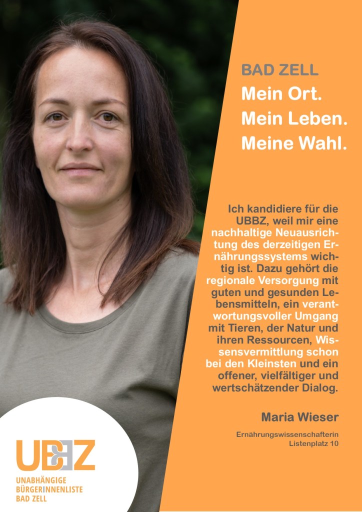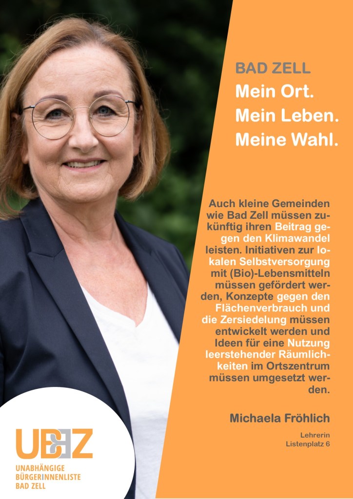 Das Programm der UBBZ umfasst die unterschiedlichsten Lebensbereiche der Bad Zellerinnen und Bad Zeller. Es setzt Schwerpunkte im guten sozialen Miteinander, beim sorgsamen Umgang mit der Natur, sei es bei der Lebensmittelerzeugung, der Raumplanung oder dem Bodenverbrauch, und nicht zuletzt bei der nachhaltigen Planung der Gemeindefinanzen.